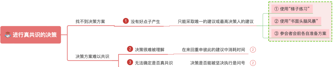 首先,我们可以将参会者分成几个小组或者直接分为个体(视参会人员数量决定),尽量保持每个小组都有一个对会议主题比较清楚的参会者,然后请每个小组讨论共识出决策措施,并且不限数量。其次,在所有参会人员面前进行分享,将所有决策措施归拢,选出大家都比较共识的决策措施。这样通过一层一层的头脑风暴再一层一层归拢,既保证了决策措施的数量,也保证了质量,同时对时间也有一定的把握,不会占用大家太多的时间。(此方法参考《卓有成效的团队管理》[英]迈克尔·A.韦斯特)