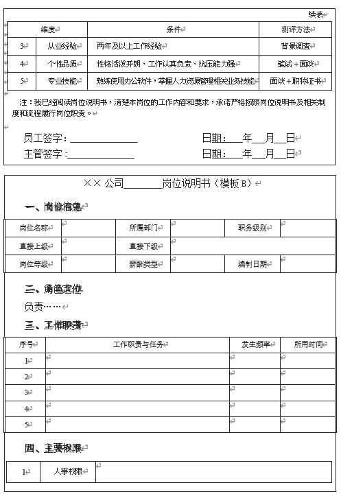 以下是我总结拟定的两个岗位说明书模板,每个模板都附带一个参考案例。目前管理基础较为薄弱的企业,可以采用模板A,后续再升级完善;而已经有岗位说明书基础的企业,可以采用模板 B。