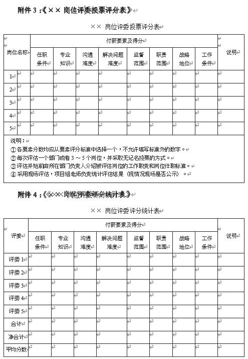 第二个阶段:可以采用两种方式评估,第一种方式是由各部门的负责人参照标杆岗位的评估分数,分别对剩下的岗位进行评估,其他小组成员不用参与;第二种方式是将相关资料直接发给评估小组成员,让每人参照标杆岗位的评估分数,分别对剩余岗位进行评估。企业可以根据实际情况,选择其中一种方式。
