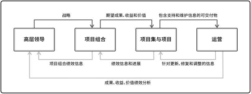 这张图我们在价值交付系统中有讲过,现在交付阶段再拿出来的目的就是让大家一定要记住,价值不是项目层面产生的,而是通过组织的战略层面先定义,通过项目组合、项目集进行结构化分解,再通过项目层面来落地实现,最终通过运营来体现价值。