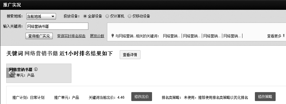 图3-50是【推广实况】界面的第一屏内容,在此你可以设置查看广告的地区和关键词,并在图3-51看到广告展现的情况。如果你发现没有排名或者排名过低,可以在图3-50的【修改出价】工具里增加出价来提高排名;如果你经常需要调整出价,觉得太麻烦了,可以使用右侧的一个工具【修改策略】,设定自己的广告排名位置或者是规定必须超过哪个同行网站。接下来就是由百度系统自动调整出价,保证你的广告有一个稳定的排名。听起来这样做还不错,但如果有几个同行也这样操作,你的广告费很可能被自动地抬到很离谱的价位。