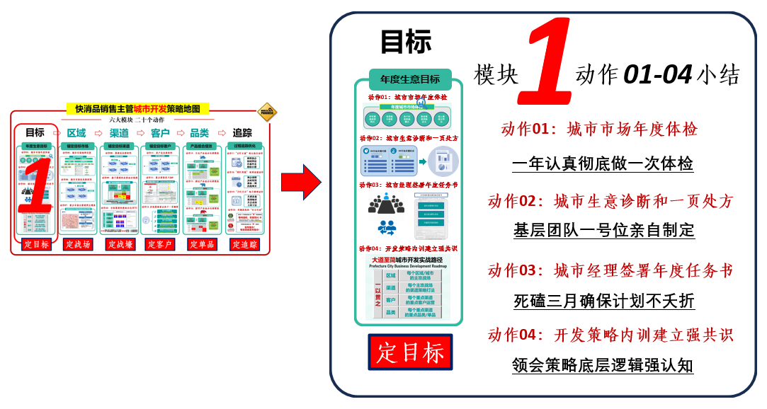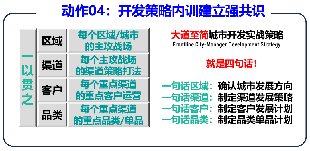 “王总,我认为动作4是不是想通过对区域、渠道、客户和品类四个方面有次序的系统性梳理,让团队所有人吃透城市市场开发策略的底层逻辑,方便大家在后续的学习中更高效地领会和吸收?”小王请教。
