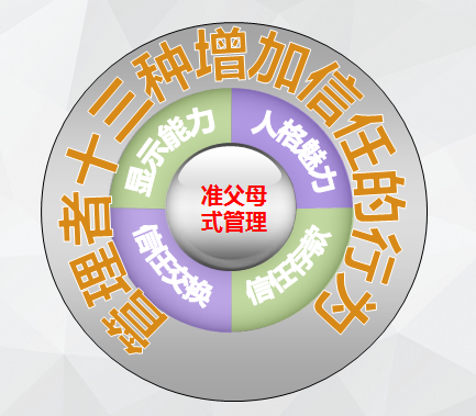 如图3-2所示,中心的一环是“准父母式管理”,代表的是建立信任的“道”;二环的四个方面 “显示能力、人格魅力、信任交换和信任存款”代表的是建立信任的“四种方法”;三环“管理者十三种增加信任的行为”,代表的是“十三种术”;当然在最后,我们还会讲如何通过“信任会”快速建立新生代团队之间的信任关系,这种方法对于建立领导和新生代之间的信任关系同样适用,这个代表的是“器”。这四个方面结合起来就是建立管理者与新生代之间信任关系的“道法术器”。