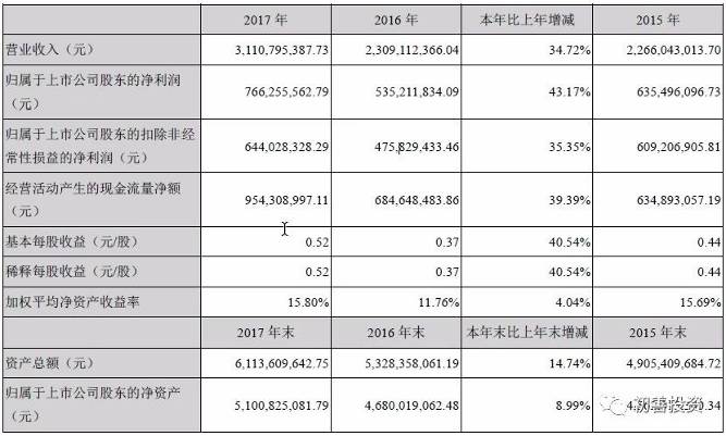 汤臣倍健的2017年年报显示,公司实现营业收入311,079.54万元,较上年同期增长34.72%;归属于上市公司股东的净利润76,625.56万元,较上年同期增长43.17%。经营活动现金流量净额高达95,430.90万元,较2016年增长39.39%,净现比大于1。如表2-3所示。