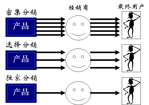 密集分销:厂家利用更多经销商销售商品,以便让客户更方便地购买,这种渠道形式在消费品中较多采用。
