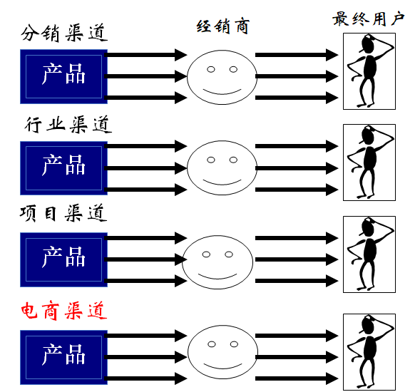 渠道的广度是多元化的不同类型渠道,分为分销渠道、行业渠道、项目渠道、电商渠道等。如图1-6所示。