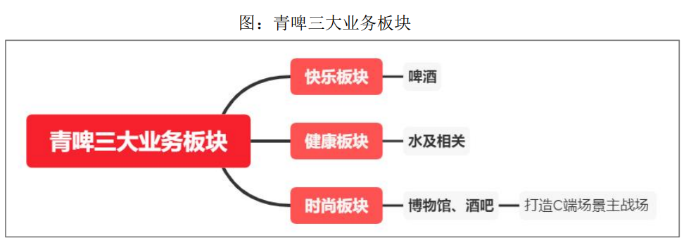 早在 2019 年,青岛啤酒集团就确立“整合平台资源实施高质量跨越式发展”战略,以啤酒为内核,布局快乐、健康、时尚三大业务板块。其中,快乐板块以啤酒业务为主;健康板块由苏打水、矿泉水、健康饮料等产品组成;时尚板块则由 TSINGTAO 1903 酒吧、青啤博物馆、啤酒精酿花园组成。