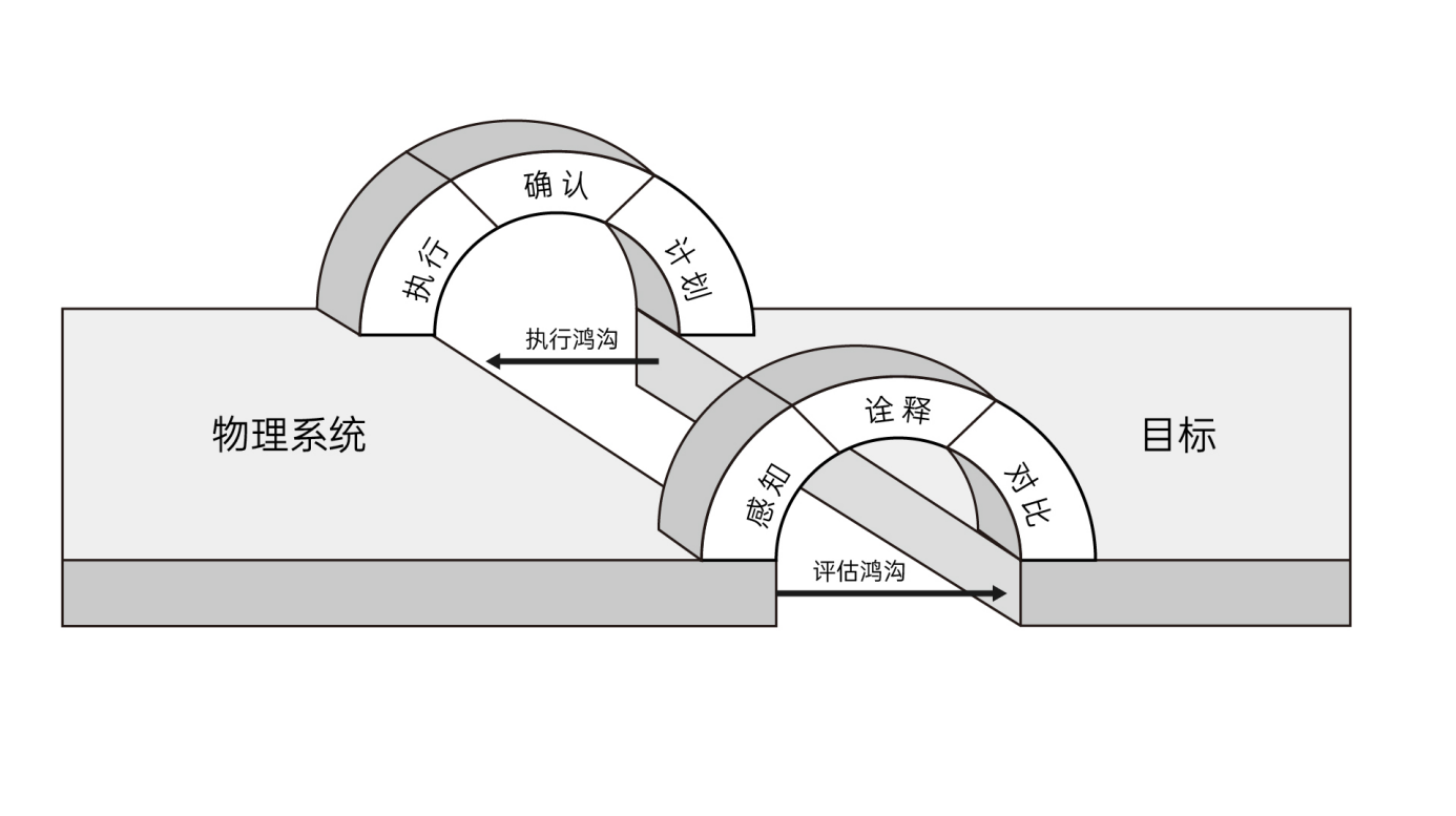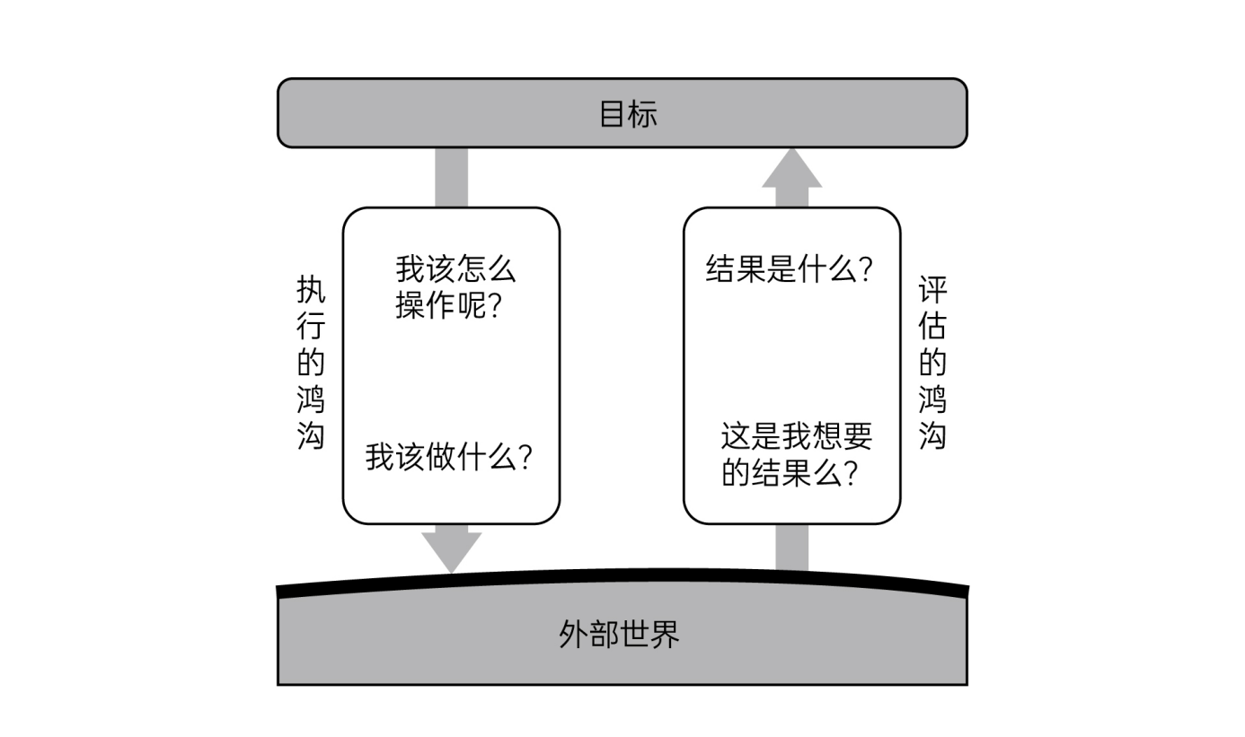 这些挑战被描述为“执行鸿沟”和“评估鸿沟”。如果没有有效的设计元素来支持用户,它们就会成为用户和他们目标之间不可逾越的障碍。如图6-3所示。