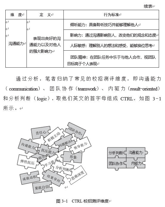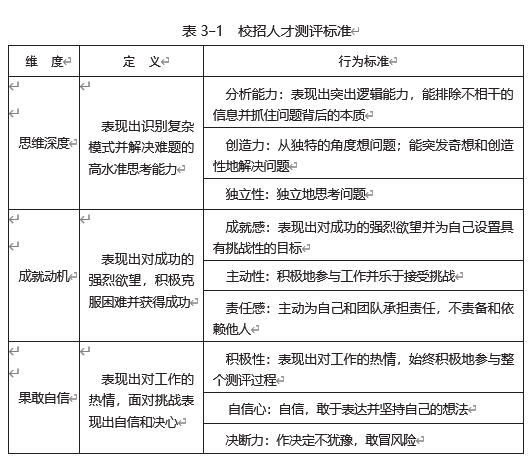 招募合适的学生,首先要有合适的标准,也就是测评维度。比如,十年前笔者为某世界 500 强快消企业设计的校招无领导小组讨论测评维度,见表 3-1。该企业当时在全国五地同时开展管培生招聘,声势浩大,应聘者上千人,测评轮次高达 7 轮。