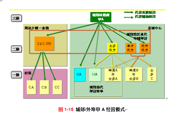 (5)城郊/外埠通路布建图解:城郊/外埠甲A经营模式如1-15所示。