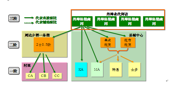 ④ 县城所有批发客户与乡镇的2±0.5阶客户由驻区业代进行拜访与转单,乡镇一阶客户由批发辐射或车销覆盖。