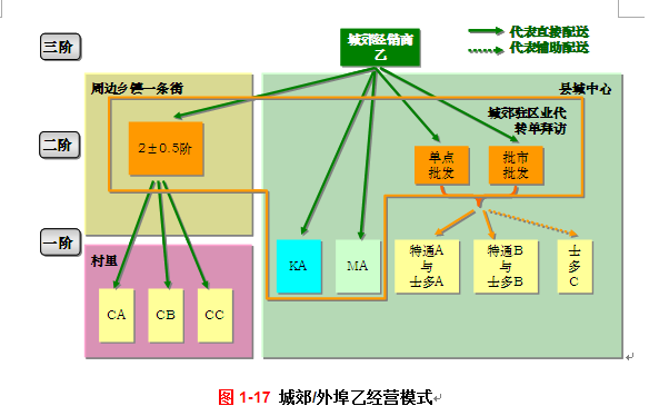 (7)城郊/外埠通路布建图解:城郊/外埠乙经营模式如1-17所示。