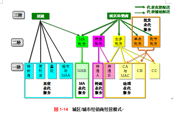 ② 直营客户由制造商所属物流配送商——顶通配送,经销通路城区/城市经销商配送,城区/城市经销商只配送批发客户。