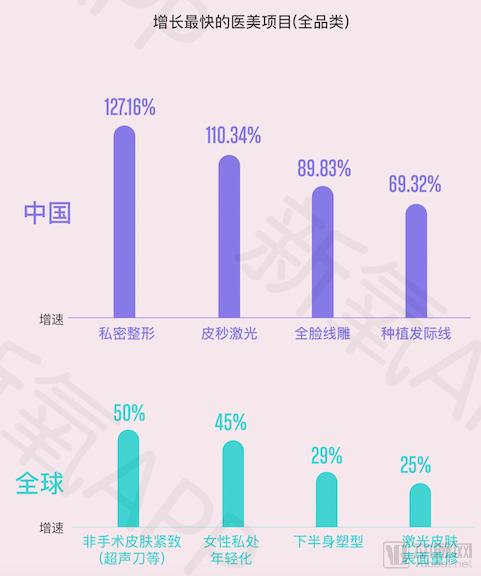 从增长最快的医美项目看,中国和全球数据亦有不同的取向。我国私密整形增速第一,皮肤类改善需求是全球增速的2倍。医美本身就是一种消费升级,而私密整形是消费升级中的升级。