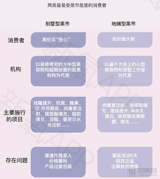 有两类消费者最易受黑市危害,一类是希望通过花高价买“安心”的消费者,另一类是图低价傻大胆的消费者。前者在装修考究的大中型美容院和超限经营的医美机构,施行线雕提升、抗衰、隆鼻、切开双眼皮、肉毒素注射、玻尿酸填充、脂肪填充、溶脂等项目。
