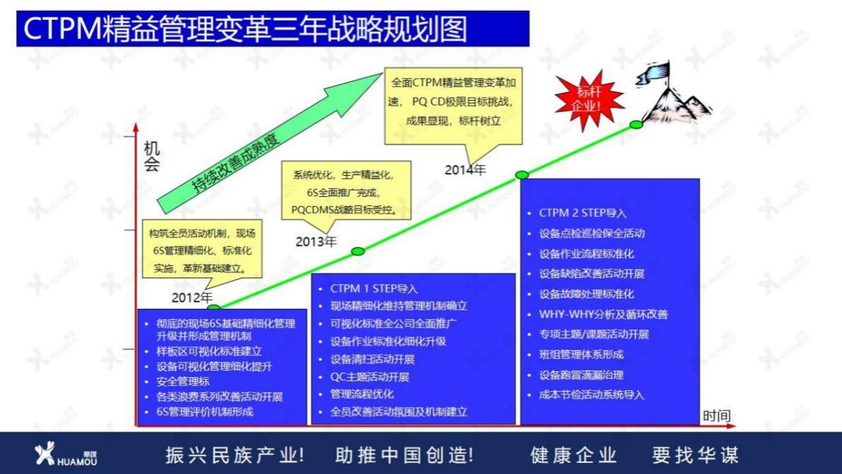 2011年10月18日黄巍总经理带领公司各部门领导参与了CTPM管理推进正式启动会,黄巍总经理向8个样板区第一责任人颁发了样板单位标示牌,宣布CTPM精益管理活动正式开始。期间华天谋顾问机构岳华新总裁对于如何作好现场管理做了动员,顾问老师对CTPM基础及6S知识进行培训。三天一层楼样板区的建设成功确保CTPM精益管理开了好局,也为后续导入各项模块奠定了基础。