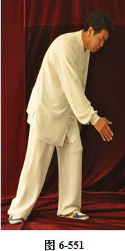 右云手:腰微含,向右外转,右脚以脚跟为轴,往右外转脚尖。左脚以脚尖为轴,往左外转脚跟。身体随腰右转面朝向西南方向; 腰向后拱,重心落于左腿,呈下倚坐式。右手随腰后拱,右下划弧摆至右侧胯旁。左手下划弧落于左腿侧旁;腰上提走弧形,左掌随腰向上走弧形,向右前穿掌,重心落于右腿上;腰微提,左脚跟随提起,向左顺开一步,掌心向右,上身微俯。腰上提身体直立,左掌抽回胸前高与乳平,掌心向里。右手弧形拉回至腹前,掌心向里。左手在上,右手在下,两臂圆撑,脊背后倚 (见图6-535至6-539)。