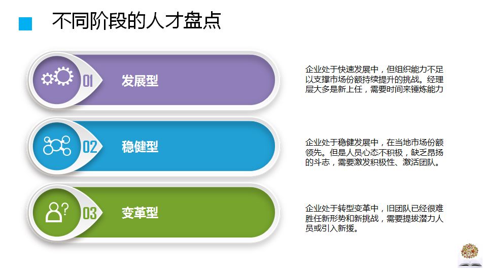 变革型:企业处于转型变革中,旧团队已经很难应对新形势和新挑战,需要提拔潜力人员或引入新援。变革型企业的特点是,企业需要淘汰一部分无法跟上节拍的员工,引入高潜后备。那么,在盘点中,注重对高潜人才的挖掘,同时注重经理人的“创新能力”。