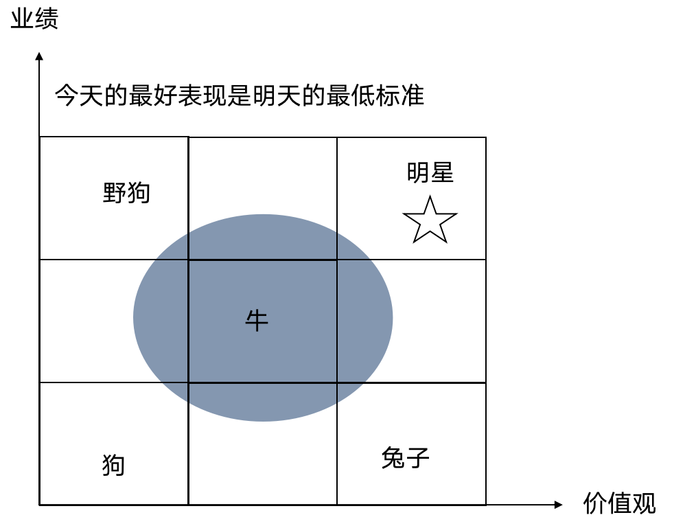 这是九宫格变形后的一种四宫格,阿里巴巴选择了“业绩”和“价值观”这两个维度。其中,“明星”是指业绩突出、个人能力强、目标和价值观认同度高的员工,这类员工在阿里巴巴会被塑造为典型,鼓励在明处;“狗”是指工作萎靡、价值观认同度低的员工,这类员工是毫不犹豫被清理的对象;“野狗”是指为了追求工作结果,不顾组织利益和价值观的员工;“兔子”是指工作态度好、认同组织价值观,但是个人能力弱、业绩长期萎靡的员工。基于此分类,阿里巴巴的人才策略执行的是坚定的“消灭野狗,请走兔子”的人才管理策略。