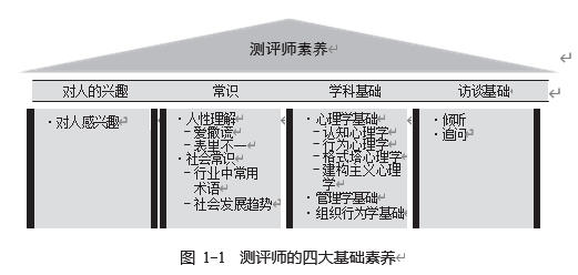 测评师的四大基础素养,便是基于对人的兴趣,发展各项技能,形成自己的方法论,如图 1-1 所示。对人感兴趣是一种怜悯心和慈悲心,它表现为当你看到路上的乞讨者时,是否心存怜悯?当你做错了一件事并对他人造成伤害时,是否深刻反思?当你看到他人的悲剧时是否心存感念,当你看到芸芸众生时,是否因为能生存在这个世界感到庆幸?如果以上你都选“是”,无疑你符合了测评师的入门条件。