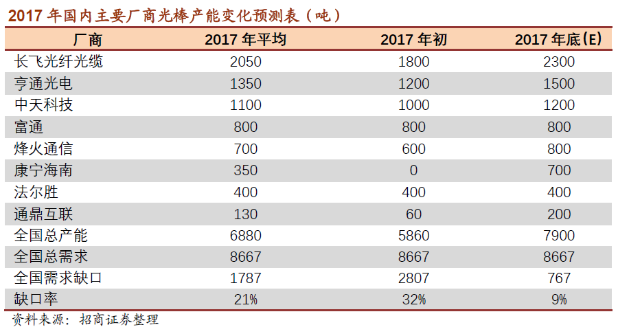 表6-19 2017国内主要厂商光棒产能变化预测表(吨)