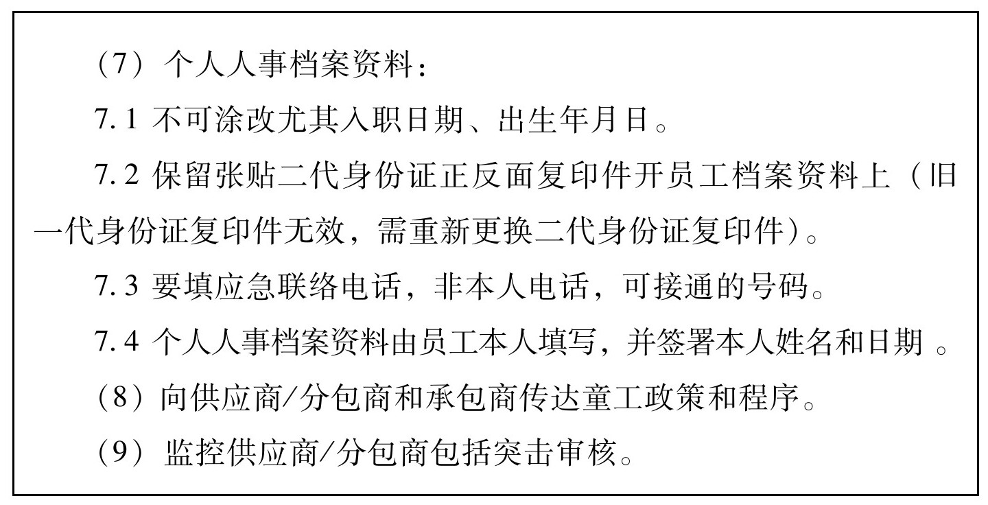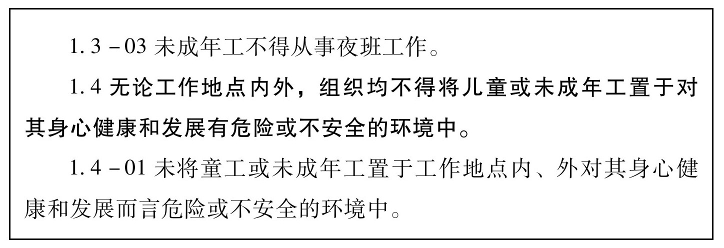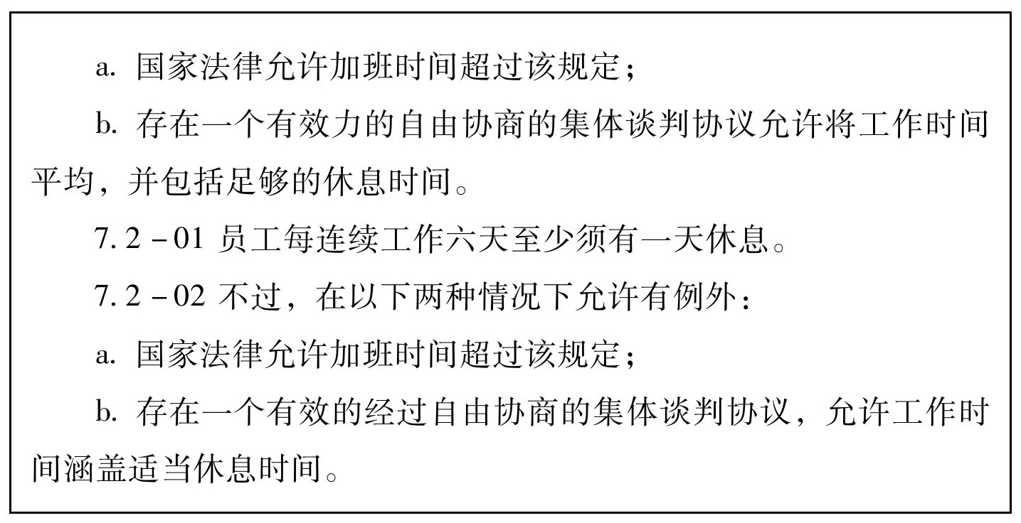 4.本标准目的在于提供一个基于联合国人权宣言,国际劳工组织(ILO)和其他国际人权惯例,劳动定额标准以及国家法律的标准,授权并保护所有在公司控制和影响范围内的生产或服务人员,包括公司自己及其供应商、分包商、分包方雇用的员工和家庭工人。