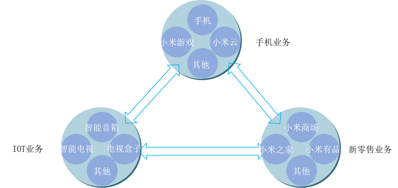 小米称自己的商业模式为“铁人三项”,即小米业务涵盖三个部分,分别是手机业务、智能硬件(IOT)业务、新零售业务(如图11-6所示)。
