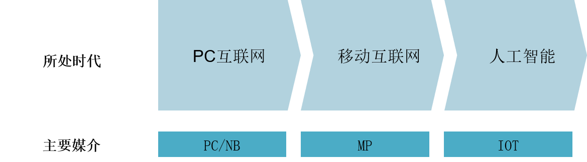 尽管如此,由于智能手机还能继续享受增长的红利,凭借超过10%的市场份额小米无疑可以保持不错的增长速度,因此小米在智能手机产业生命周期进入衰退期之前也没有更多的创新(包括价值链和价值网创新)。时间来到了2015年,政府提出了消费升级和供给侧改革的口号,在这一年小米生态链建设获得了实质性的收获。小米生态链建设是为了迎合人工智能时代的到来而准备的,比较人工智能及其前两个时代、主要媒介列举在一起,如图11-8所示。