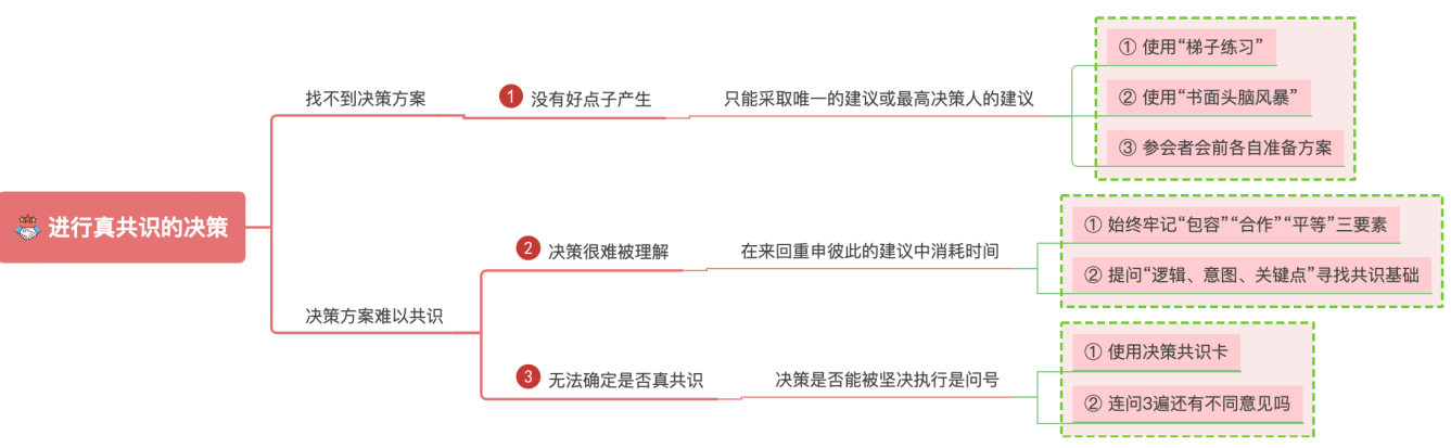 大多数时候我们有前面的意识和做法,一定会大幅提升我们形成真共识的效率。但我们对于会议决策的这样一个关键环节——共识决策。我们一定要现场做确认,确认是否参会人员都一致共识了这个决策,并会认真对待与执行。