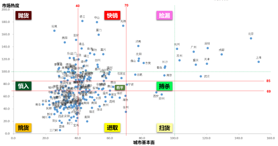 抛货区、快销区、慎入区,建议房地产企业谨慎拓展,未进驻城市,则不进驻,已进驻城市,以出货为主。