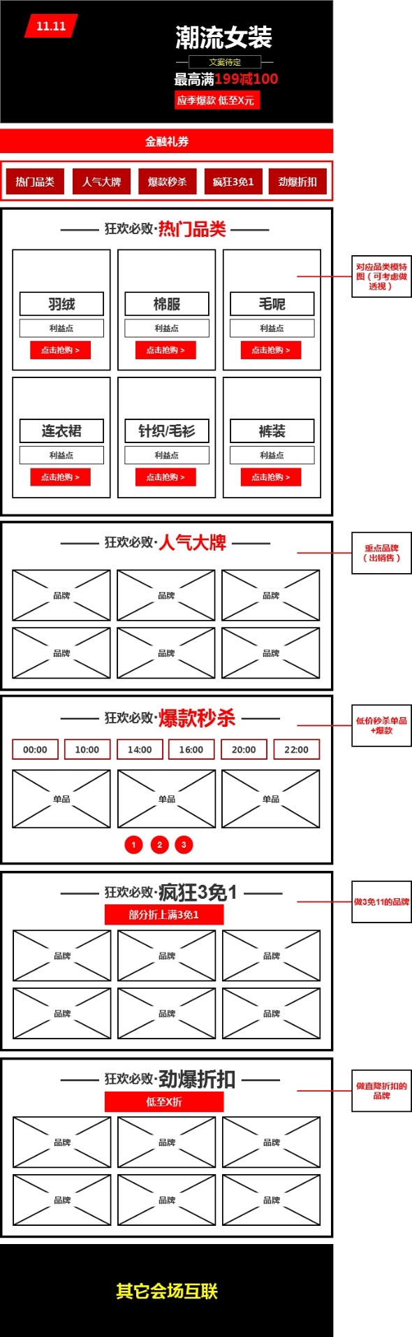 要求:主打清仓及秋冬爆款,区分抢购主会场,要求日常商品5折及以下,新人价要与“双11”持平或更低。