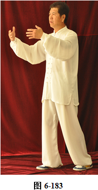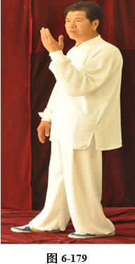 掤:右腰上提,右脚向前迈步,重心渐渐移至中间,成右弓步; 腰继续上提,右小臂同时向右上前方打掤,右掤手高与膻中穴平。左手掌心向下置于左胯旁,意念领腰继续上提,右手随之向右上撩掤,左掌跟随向上,当掤至略高于肩时,两掌翻转掌心斜相对(见图6-174至6-189)。