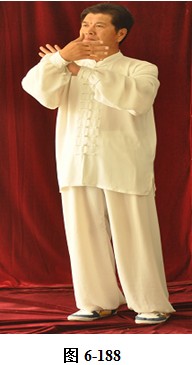 注意:身体左右转动时,要以腰为轴,内劲带动,身体保持中正、松肩、松胯、松膝。这套拳自始至终对身形的要求都是一致的, 动作要柔缓,速度要均匀,手脚的动作配合更要协调一致。弓步时小腿要垂直,膝盖以不超过脚趾与脚掌相连的指节为宜。