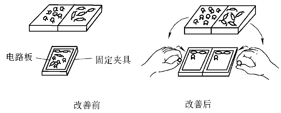 减少动作数量 | 1.消除不必要动作 | 1.将材料或工装夹具放在操作人员前方的一定位置 | 1.利用易取材料或元件的容器或器具 |