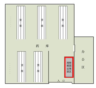 经过现场观测,发现医院药房收货上架后的周转箱存放环节是关键点。一家医院的药房布置如图12-3所示,有专门的周转箱存放的架子,办公室在药库门口,有效地防止了周转箱流出药房。