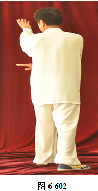 接上式,腰微拱,向右后旋转,身体随之右转,带左脚提起, 向右前方迈步,脚跟着地,脚尖内转,身体转向西南;腰微含继续旋转,身体转向西北。右脚跟向里稍转,脚尖朝向西北。同时左臂外旋内收至左肋旁,掌心朝上;右手向右后划一大弧,回至胸前,掌心向下;腰上提,提左膝向左前上方迈步,左掌向左前方穿掌,掌心朝上指向西北,右手臂贴近左肘下。腰微拱,向右转,身体随之后移,重心移于右腿。左脚尖向里内转,朝向东北,身体转朝向东北;左手臂随身体右转,划弧回拉至右耳侧旁。右手回拉至左腹侧;腰微向左回转,身随之回转,重心回移左腿;腰下沉,左腿屈膝坐实,右脚掌着地,微屈膝,成右虚步;腰自左向右上旋转,身体随之向右平移,右掌移于身体右前方, 左掌移于右腕里侧, 稍低于右掌, 眼随转体平视转移,观及两掌右移。右脚自左向右上方弧形外摆, 膝部自然微屈,脚抬摆不超过腰部,脚背略侧朝向右面。同时左手上抬,两掌自右向左迎着右脚面虚拍打, 先左手后右手。眼神观视两掌拍打右脚面(见图6-601至6-605)。