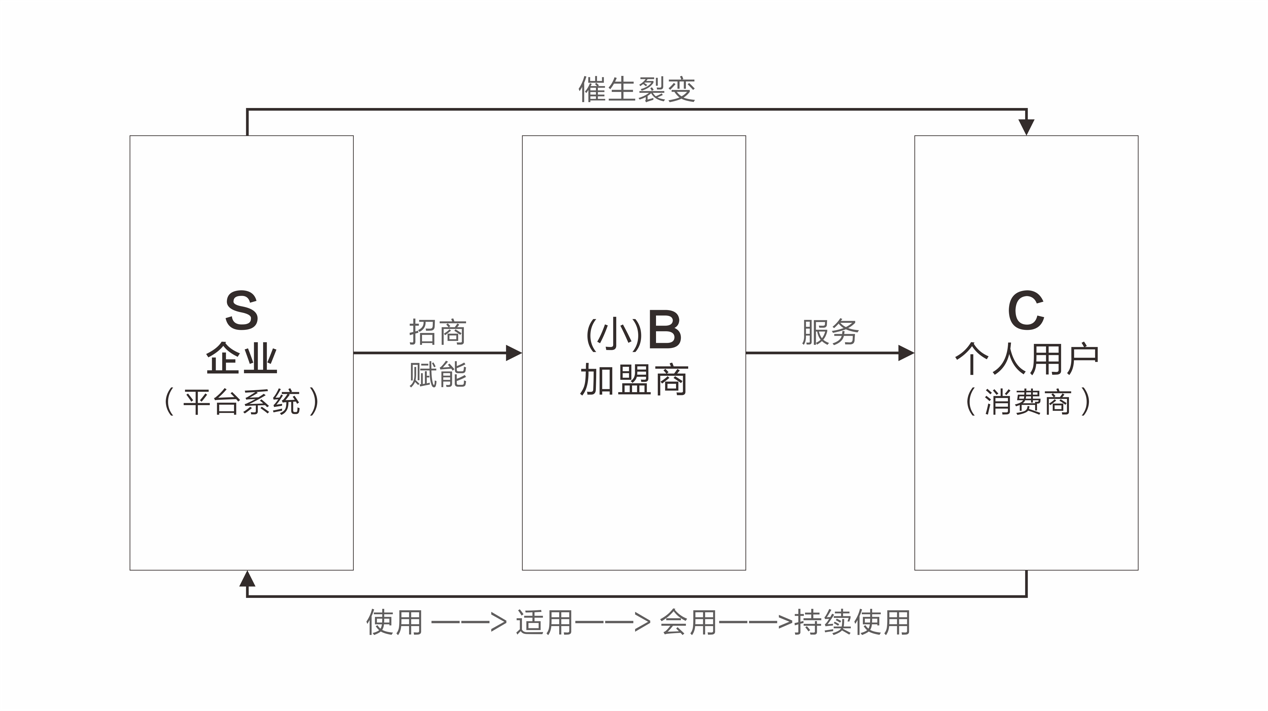 S2B2C = S2B(招商/赋能)+【 B2C(服务)+ S2C(裂变)】