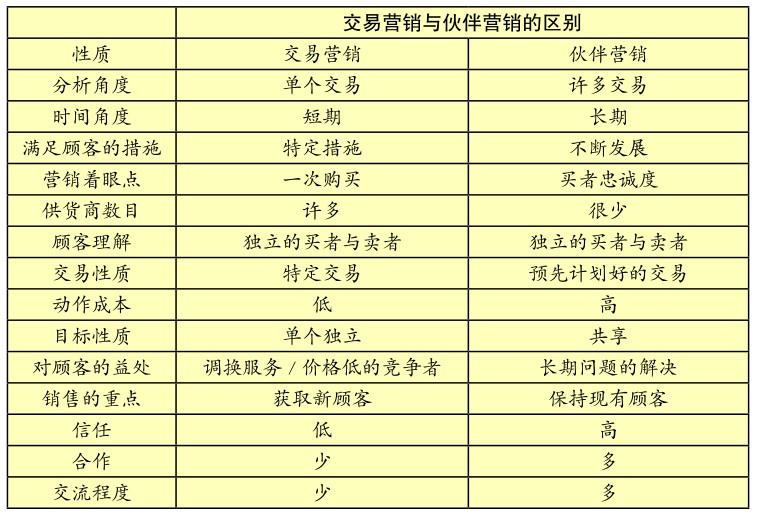 表4-1从15个方面列出了交易营销与伙伴营销的主要不同之处。在这些区别中,必须注意,一系列单个的交易营销不能混同于伙伴营销,但交易营销可以像伙伴营销一样是长期的。