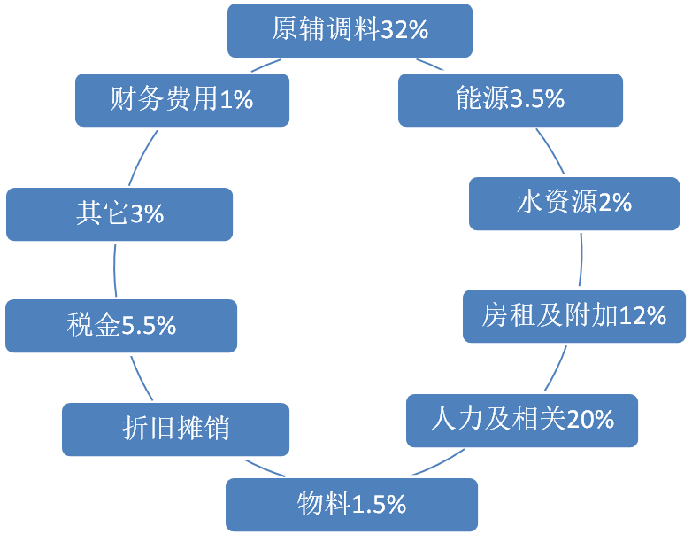 餐饮的10大运营成本包括:原辅调料占32%、能源占3.5%、水资源占2%、房租及附加占12%、人力及相关费用占20%、物料占1.5%、折旧和摊销、税金5.5%、其它3%、财务费用1%。