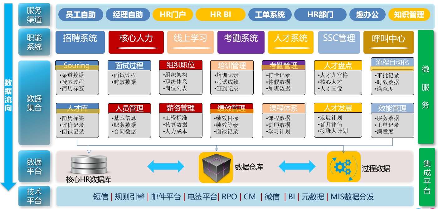 图11-1是某公司的HRIT运行框架,这张图可以看到IT系统的系统板块包含服务渠道、微服务(包括职能系统及其数据集合)和集成平台(包括数据平台和技术平台)三个大平台,服务内容几乎包含从招聘、学习、薪酬绩效、员工服务到员工问答的人力资源日常管理的所有方面。