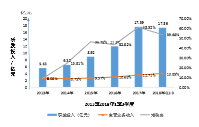 恒瑞医药2013年至2018年前三个季度研发、收入与增长率情况见图2-30所示。