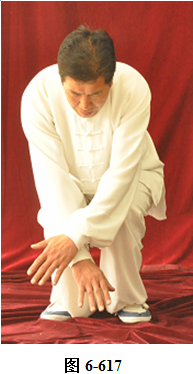 接之式,腰后拱,成后倚坐式,重心渐渐移至右腿上,左脚内转,脚尖朝向正南,身体亦转向正南;左腰上提,重心随即转向左腿上;右腰向右上提,随即右腿向右外上方开步,两臂随之外旋向两侧打开,与肩平行,两手心向下;左腰向右上提,重心随之渐渐移向右腿,两臂随之下垂,左臂置于左膝外侧,右臂落至与右膝垂直;左腰微提,左臂与左腿同时向右并拢,成蹲式。左右两臂交叉, 左手臂在上,两手心向下;腰上提,身体直立,两臂随身体直立, 呈十字,两掌翻转,手心朝外,眼神平视。(见图6-615至6-618)
