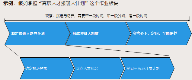 如图2-17所示,在“高层人才接班人计划”这个作业板块中,制订接班人计划是一个小模块,其中包涵确定接班需求,盘点人才状况,制订与实施开发计划,然后再形成接班人制度。所以当你负责局部时,有总监给你规划;当你负责整体时,自己就要规划好每步怎么做,要十分明确。