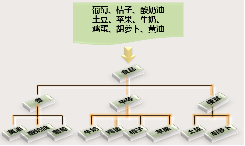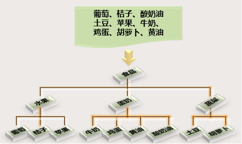 比如我们在整理资料时,会发现有很多的素材,那么就需要将所有的资料都分类整理,方便查找和检索。图2-20是将水果归在一个类别里面,包含葡萄、桔子、苹果。