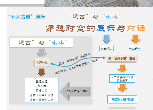 在本次策划中,我提出“晋派文化”演绎——凝练平遥2700多年文化,以创意思维为主导,以内容产业为铺垫,强化晋商精神——展现中国金融业鼻祖的文化传承。在功能上强调复合型定位,展示+会议+培训+旅游+商业(含酒店、客栈、餐饮、酒吧等)=提供“五位一体”的城市服务。