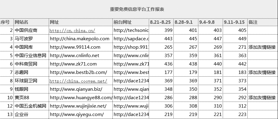 此表每周统计一次,以累计数字的方式记录我们在重要灌水平台上的灌水总量。如果该灌水平台还能做友情链接需要在备注里说明,这个表格还记录着重要的用户名和密码列,在此做了隐藏。注意,表格中的“网址”指的是这个平台首页,“前台网址”一般是我们开设的店铺网址,不需要用户名和密码就能看到的,方便领导检查灌水工作。