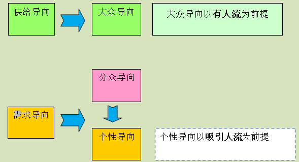 商业存在的前提是因为有需求的存在。当拥有了足够的人流,供给就会应运而生,我们则成了供给的“向导”。但是,通过对未来城市发展过程中很多因素尤其是在政府推动作用下的新区以特色来吸引人流的预测,于是需求导向——为了一部分人的需求而建立的特色的、特定的商业业态和主题模式以此来吸引这部分人群从而来引导消费就此而产生了。