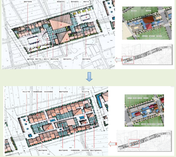 但是,在策划实施的过程中我们发现一个很严重的问题,即那些进驻的商家主要集中在商业街的一条道上,从而解决不了两边商铺的经营形式问题。经过近两个多月的调研,五位专家得出了一个结论:中间经营商业,两边则分别设置成主街道。于是,通过两边的街道人们才得以进入“商业街镇”。这并不是基于设计上的问题而做出的考虑,而是对现有商业的所进行的考虑。为了配合规划时的建筑设计,这样的“商业街镇”才应运而生。我对这个战略成果进行了可视化地表现。如下图所示(PPT节选):