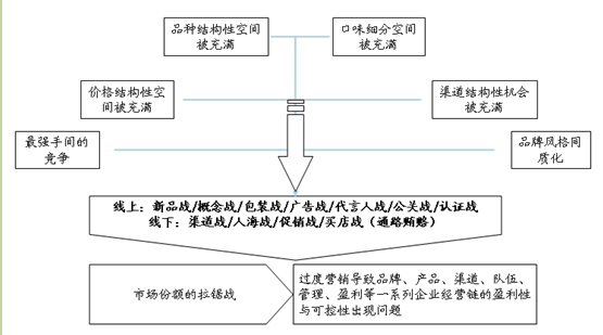 通过对以上线上竞争形式的简单梳理,可以看到过度营销是市场竞争达到高级阶段的产物。从内在要素上看,线上线下的竞争,背后是关键营销要素的同质化:市场的价格带区间、品种/品类细分、口味细分、渠道细分、品牌风格细分等核心要素,已经没有空白的结构性机会,而是被同质化的产品所充满,形成了针尖对麦芒的“战略相持性”竞争格局。