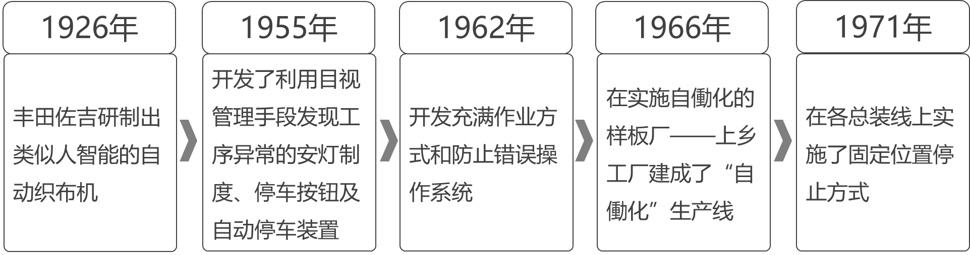 下面再来看一看“自働化”的意思。生产和工作都避免不了“异常”情况。可以说,每天的生产,都会发生各种各样的“异常”,需要马上处理。现场希望尽可能减少异常的发生,对于可能发展成致命问题的异常,则希望绝对避免。为此,最好的办法就是防患于未然。“自働化”就是针对这种情况的概念。即在机器里设置各种“监视活动”的机能,以防止事故和问题的发生。同时,尽可能不让机器自身发生异堂,从而提高质量和产量,这也可以实现节约日人(省人化)另一个效用是从“通知异常”中派生出来的“可视化”。
